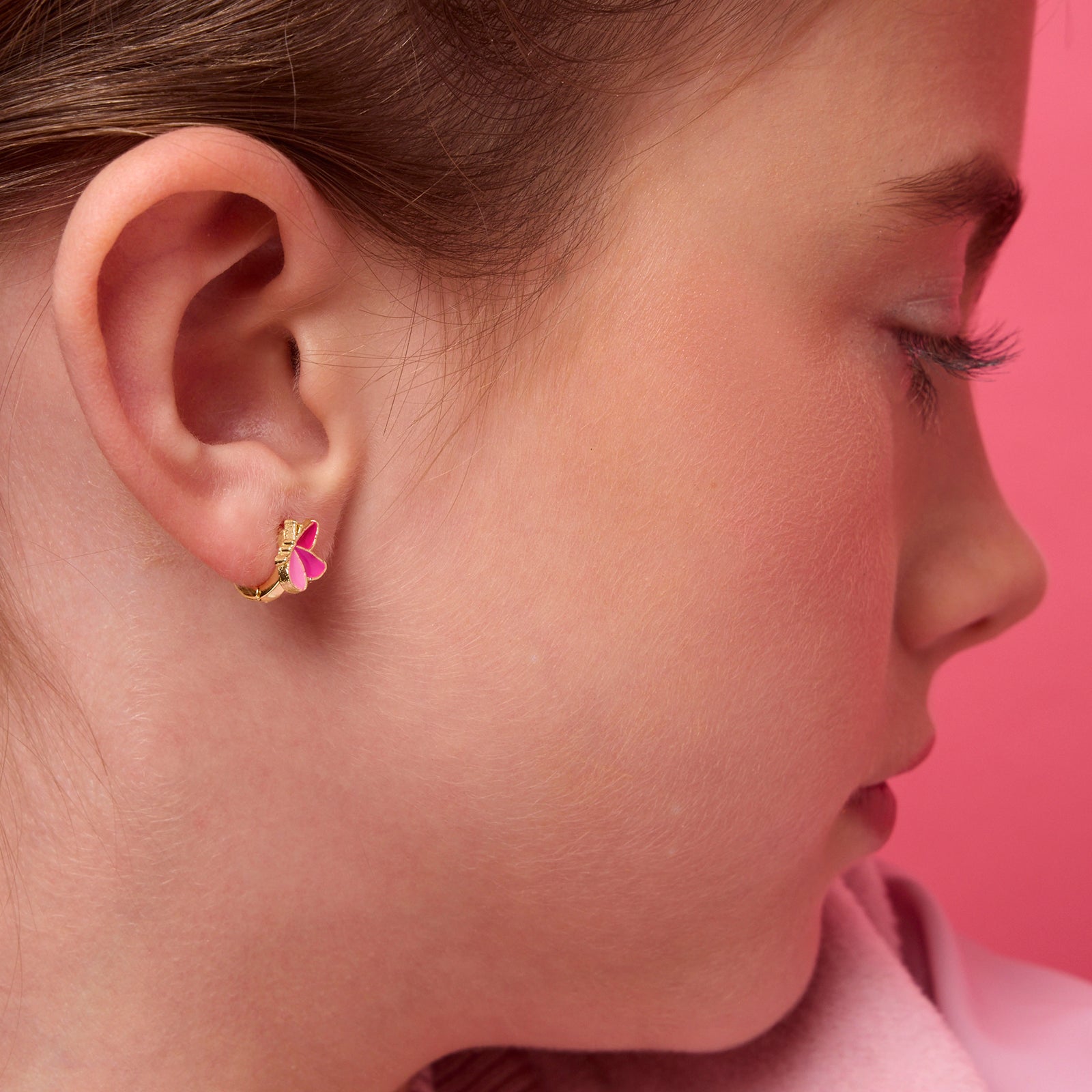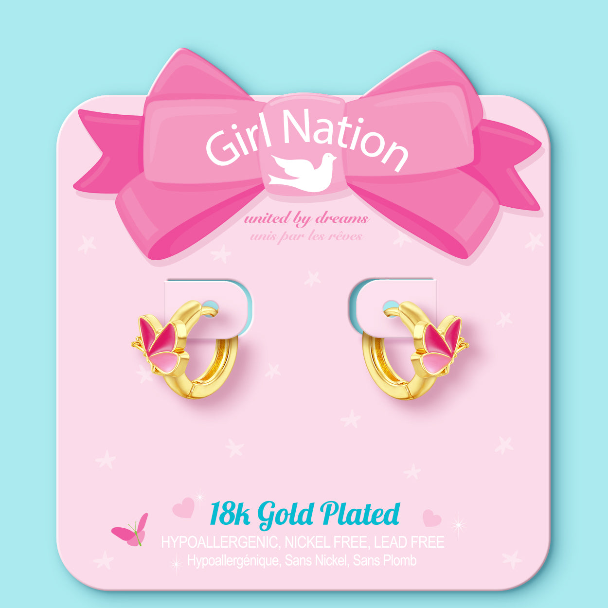 18K gold plated Easter gift butterfly huggie earrings for girls. Hypoallergenic kids jewelry and perfect Easter basket stuffer by Girl Nation Canada.