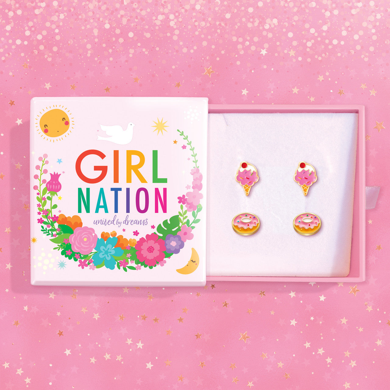 The perfect gift for little cuties! The Dynamic Duo Gift Set includes two pairs of themed Cutie Stud Earrings in an adorable Girl Nation gift box. The Sprinkles & Scoops Gift Set includes donut and ice cream cone earrings.