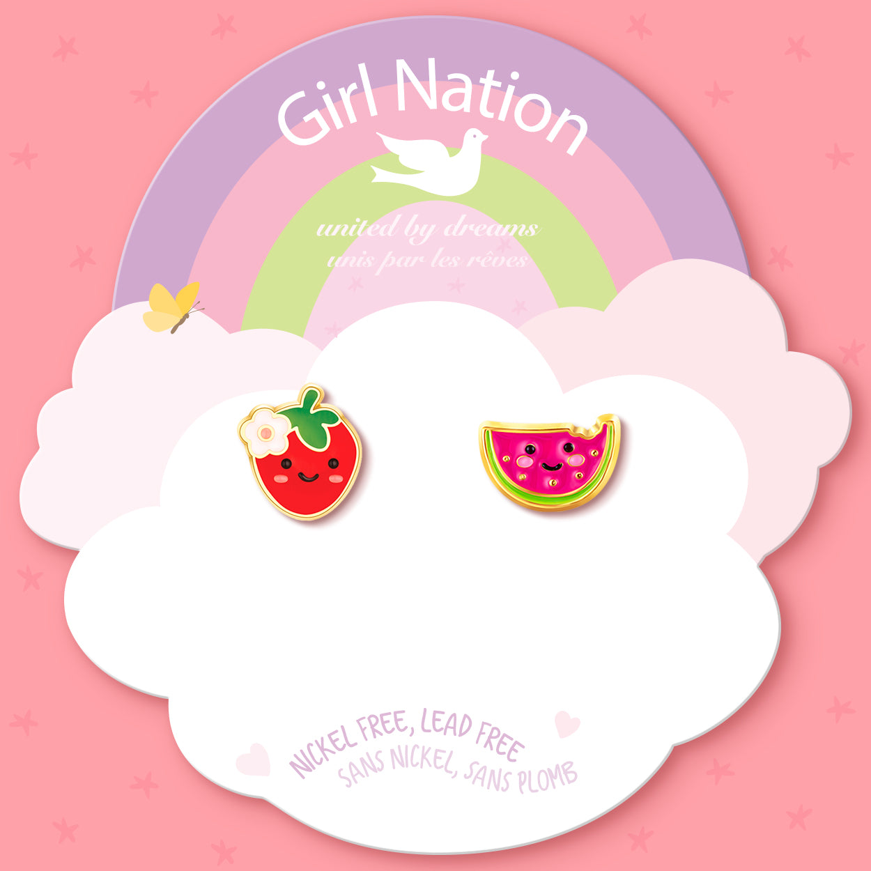 Get a taste of summer style with the Berry Melon Twist Cutie Earrings | The Perfect Pair. This refreshing mismatched set features a sweet smiling strawberry and a juicy slice of watermelon, bringing a burst of fruit-filled fun to her jewelry collection. These enamel studs are a playful and vibrant accessory for little ones who love bright colors and whimsical, nature-inspired designs.