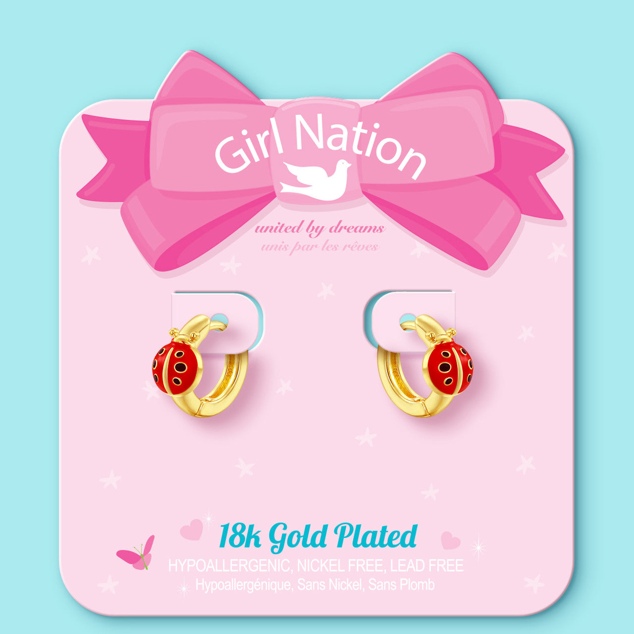 Easter gift 18K gold plated ladybug earrings for girls. Hypoallergenic kids jewelry and perfect Easter basket stuffer by Girl Nation Canada.