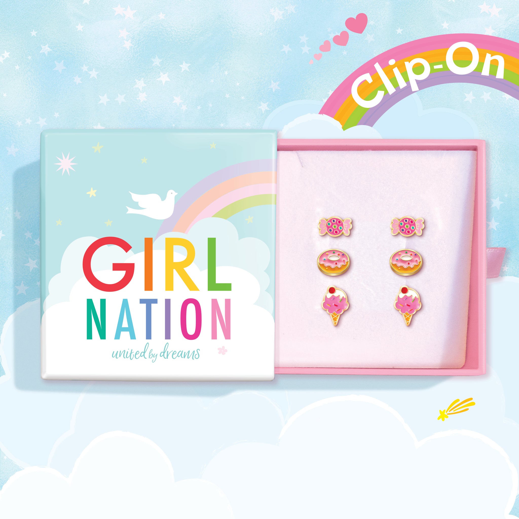 The perfect gift for little cuties with non-pierced ears! The Triple Treasure Clip On Gift Set includes three pairs of themed Cutie Clip On Earrings in an adorable Girl Nation Gift Box. The Sweet Shoppe set features a colorful candy, a delicious donut, and a refreshing ice cream cone, making it a wonderful choice for a sweet summer break treat, a kindergarten graduation reward, or a special birthday surprise.