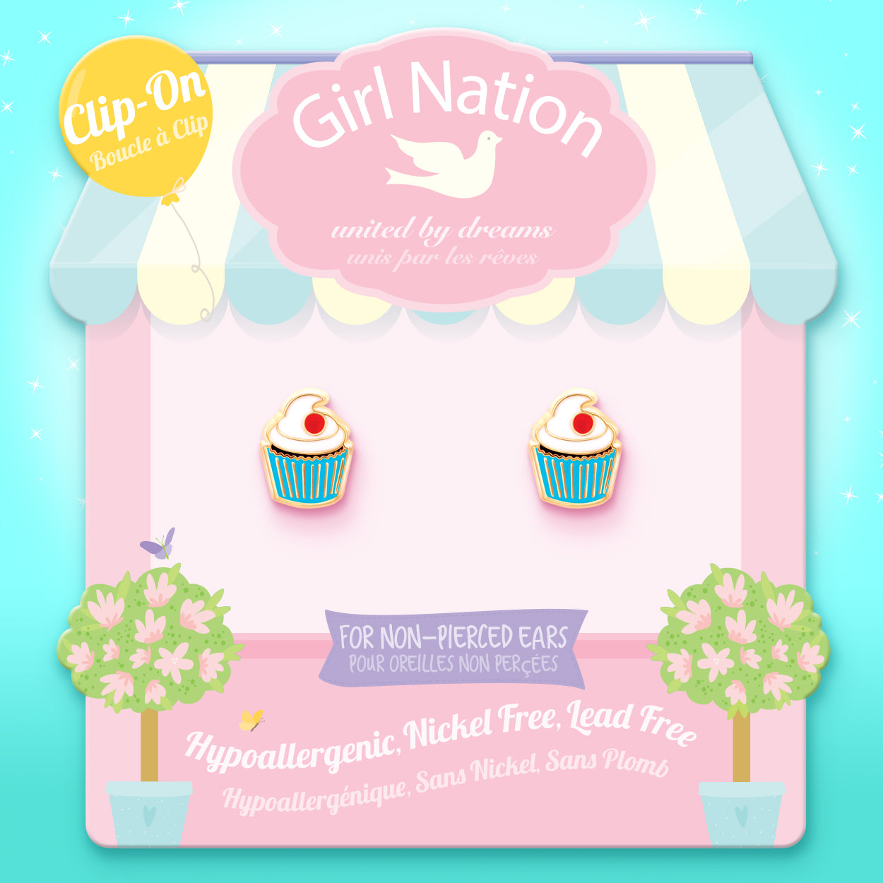 These Classic Cupcake clip-on earrings feature a sweet white frosting swirl topped with a bright red cherry.