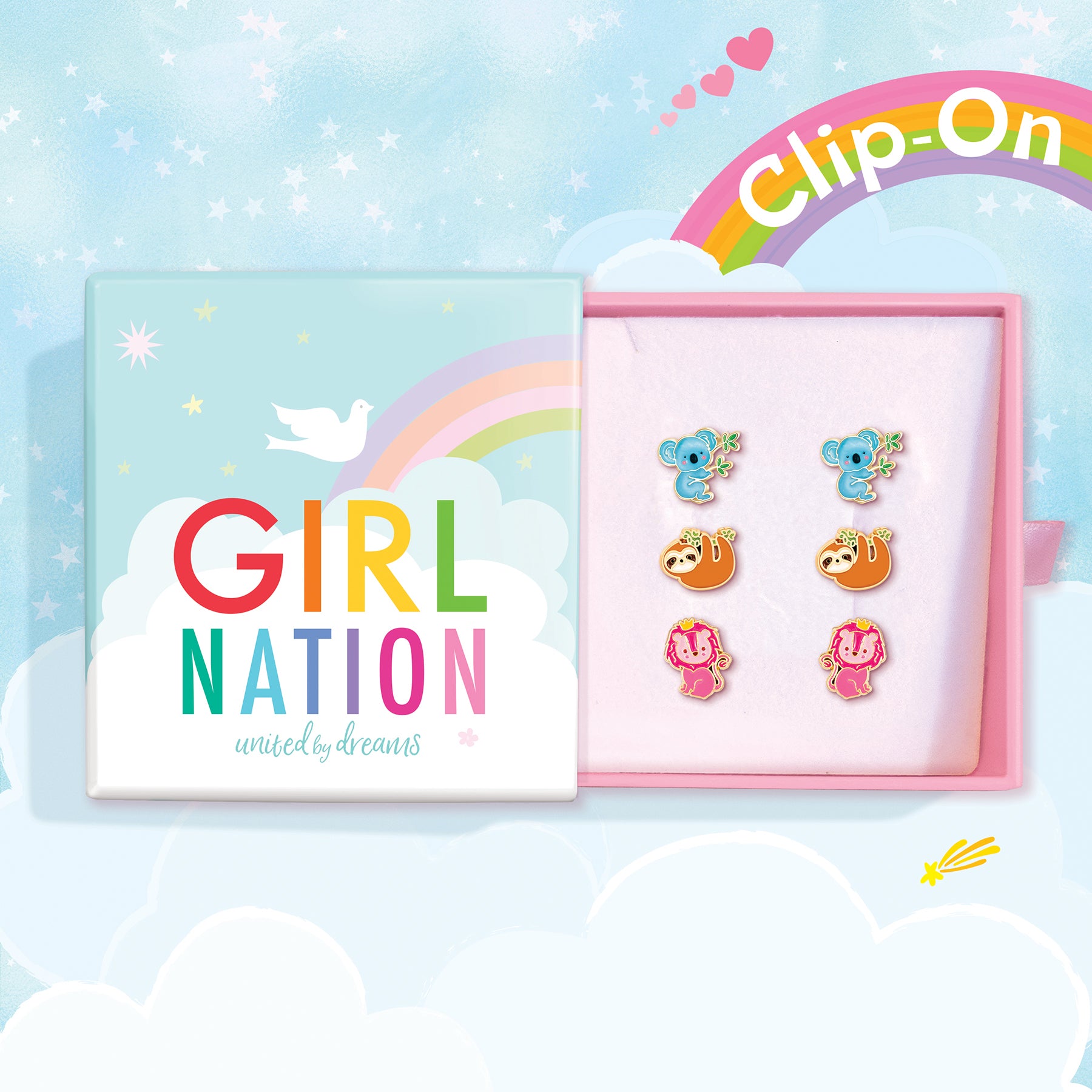 The perfect gift for little cuties with non-pierced ears! The Triple Treasure Clip On Gift Set includes three pairs of themed kids earrings in an adorable Girl Nation Gift Box. The Zoo Crew set features a cuddly blue koala, a sleepy orange sloth, and a brave pink lion, providing a charming and stylish look for children. These are the ultimate comfortable earrings for kids, making them a wonderful choice for a jungle-themed birthday surprise, a fun zoo trip souvenir, or a special treat for animal lovers.