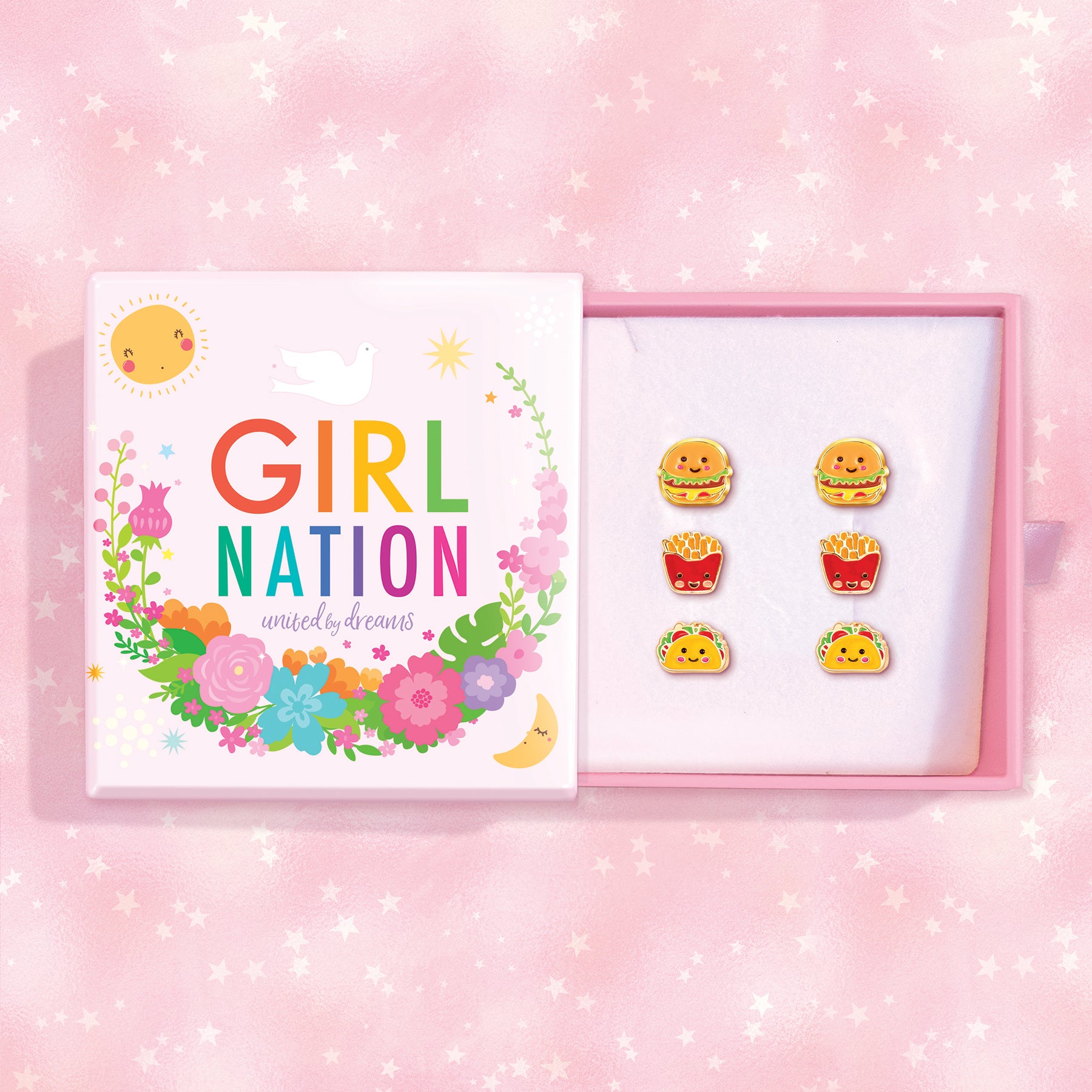 The perfect gift for little cuties! The Triple Treasure Gift Set includes three pairs of themed Cutie Stud Earrings in an adorable Girl Nation Gift Box. The Fast Food Trio includes a smiling hamburger, a classic red box of french fries, and a delicious taco, making it a wonderful choice for a funny birthday surprise, a unique best friend gift, or a playful treat for any food lover.