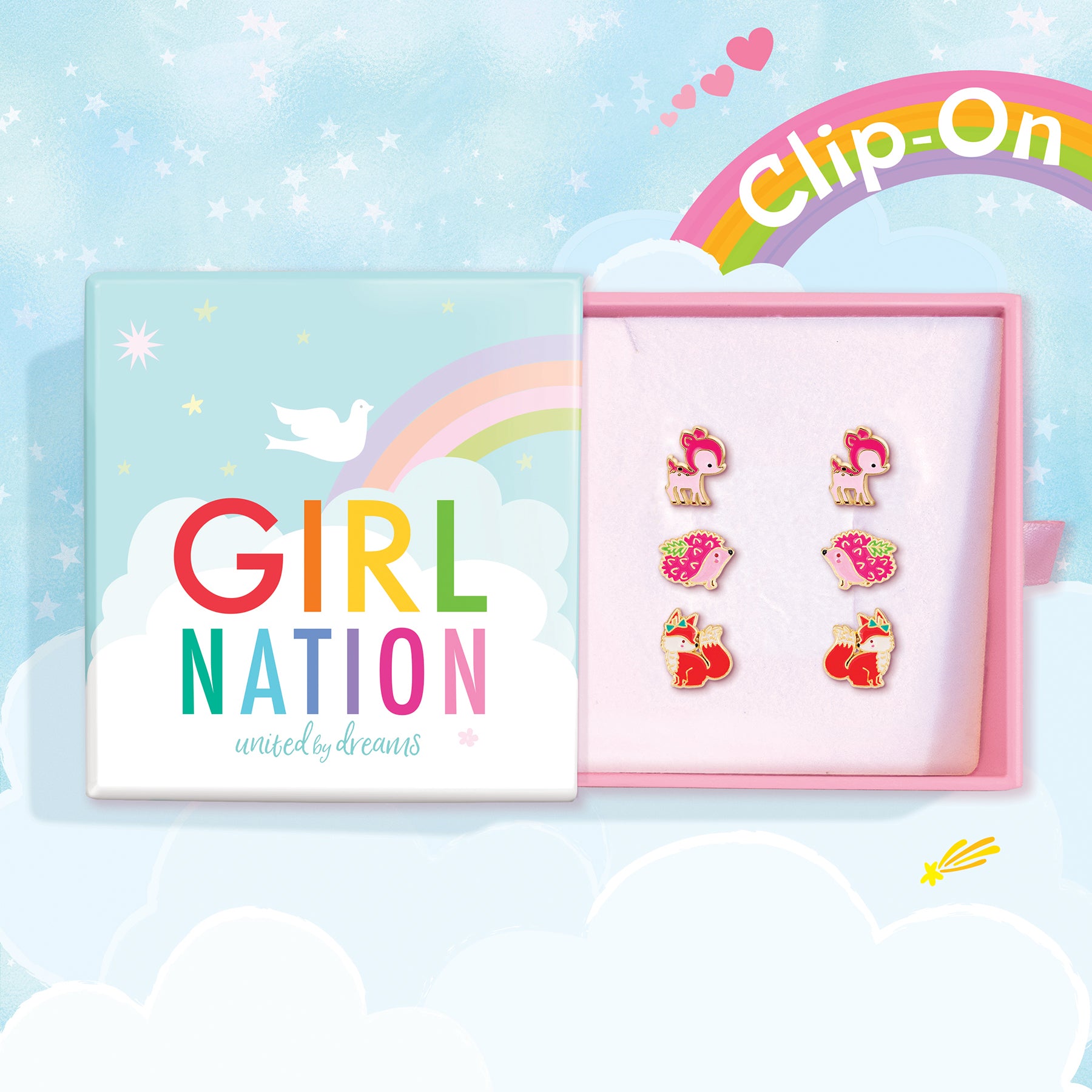 The perfect gift for little cuties with non-pierced ears! The Triple Treasure Clip On Gift Set includes three pairs of themed kids earrings in an adorable Girl Nation Gift Box. The Forest Friends set features a graceful pink deer, a sweet reddish hedgehog with leaf accents, and a charming fox with flower details, providing a whimsical and stylish look for children. These are the ultimate comfortable earrings for kids, making them a wonderful choice for a nature-themed birthday surprise, a magical woodland party, or a special treat for animal lovers.