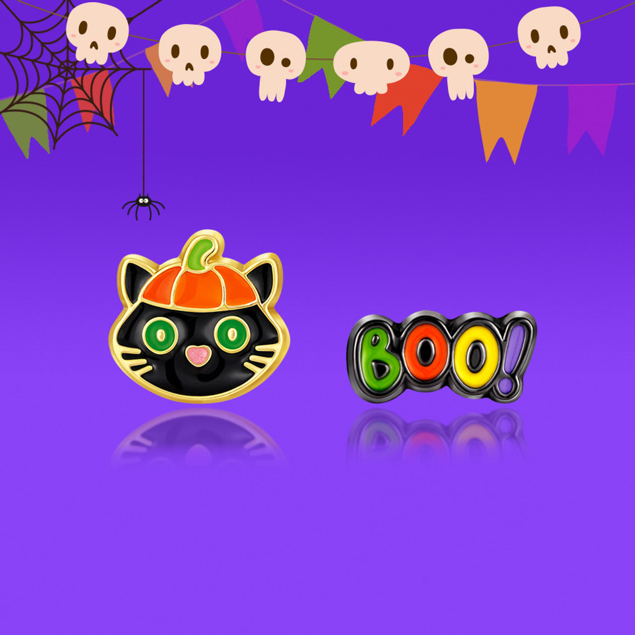 This playful Halloween pair mixes a pumpkin-hat black cat with a colorful “BOO!” text stud, creating a fun and spirited accessory for October adventures. The bright enamel colors and expressive designs bring instant festive charm to any outfit.