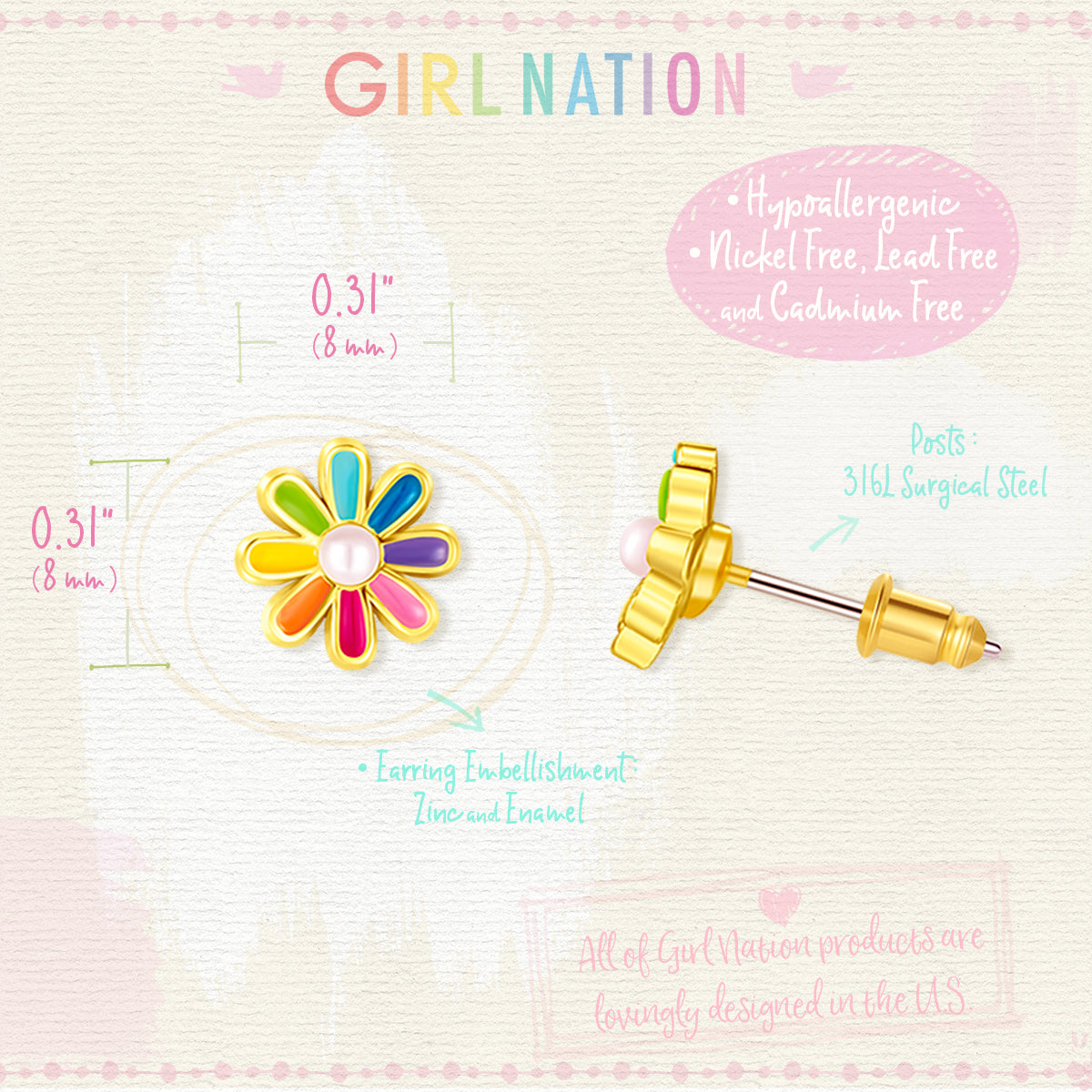 Easter gift rainbow daisy earrings for girls. Hypoallergenic kids earrings and perfect Easter basket stuffer by Girl Nation Canada.