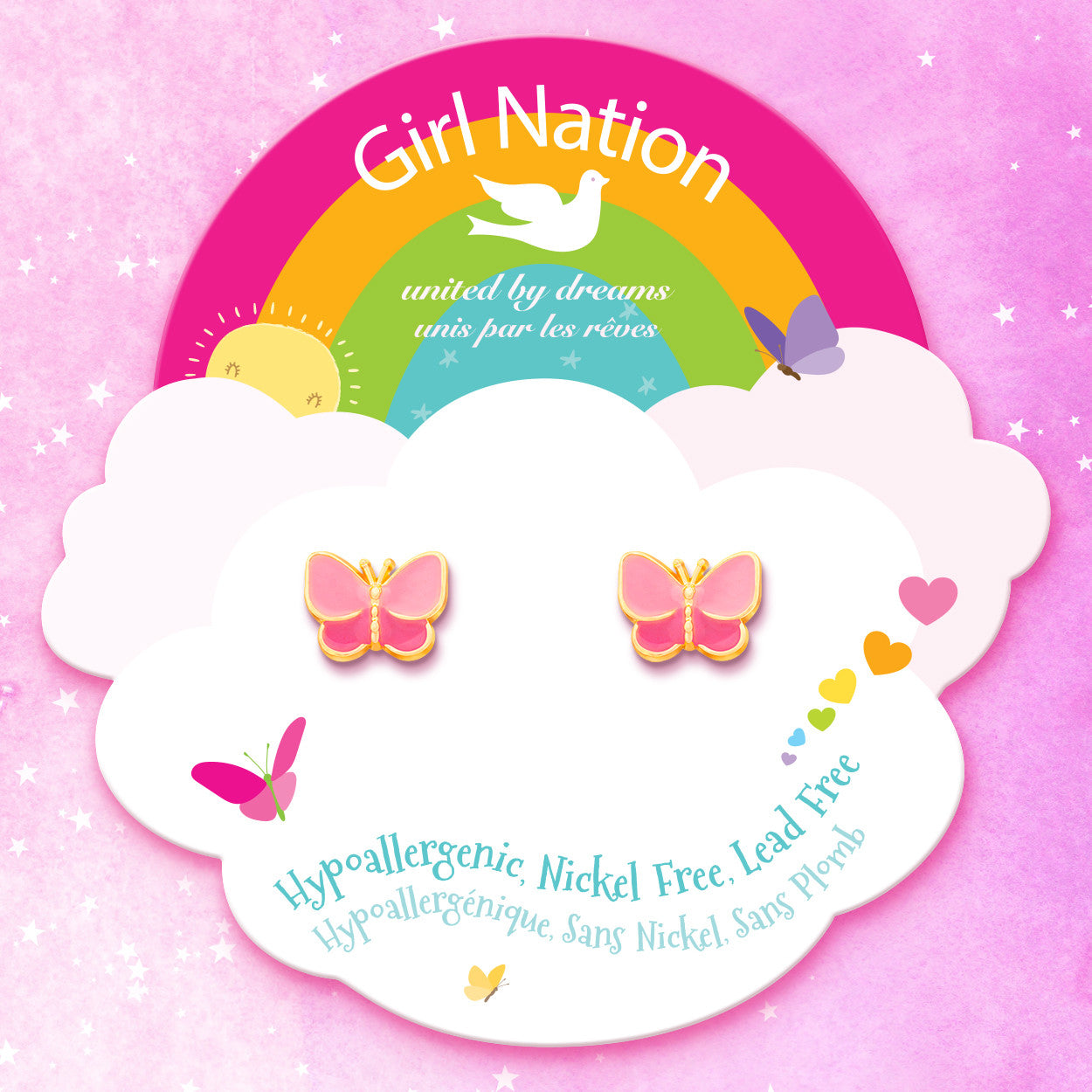 Easter gift sweet pink butterfly stud earrings for girls. Hypoallergenic kids jewelry and perfect Easter basket stuffer by Girl Nation Canada.