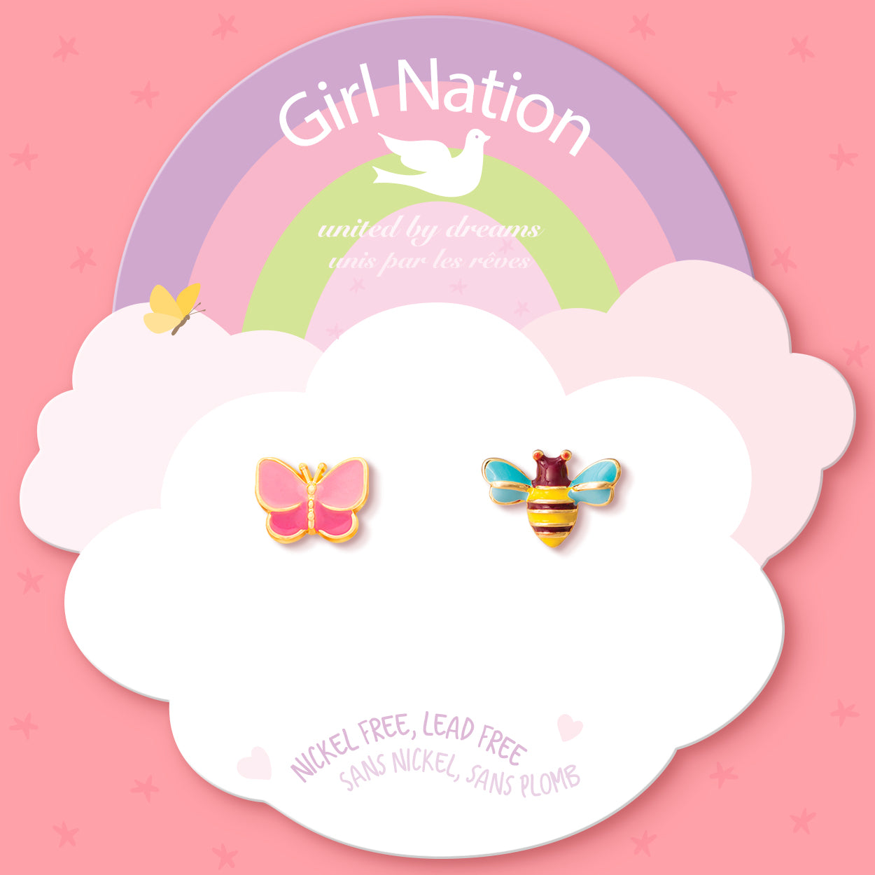 Easter gift butterfly and bee stud earrings for girls. Hypoallergenic kids jewelry and perfect Easter basket stuffer by Girl Nation Canada.