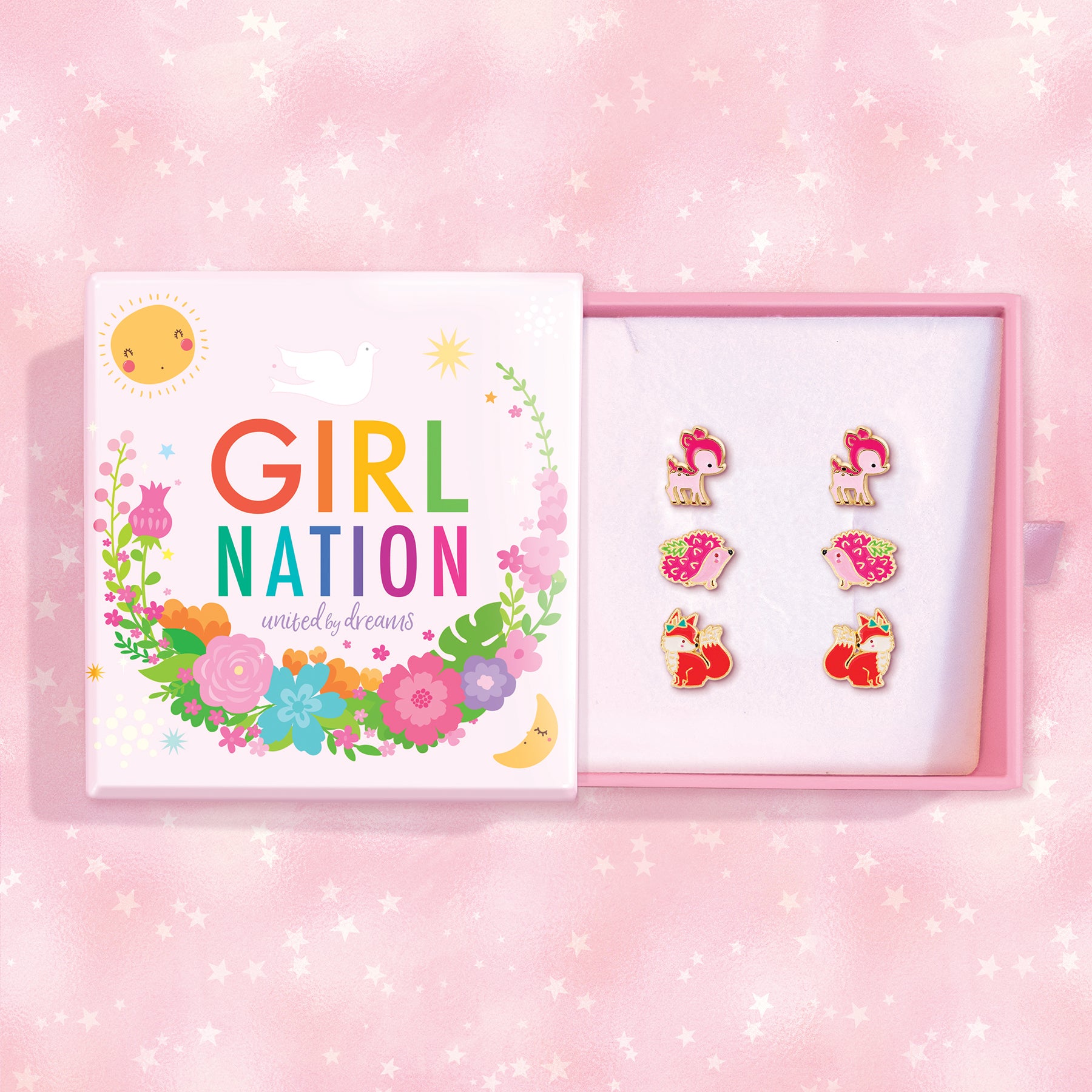 The perfect gift for little cuties! The Triple Treasure Gift Set includes three pairs of themed Cutie Stud Earrings in an adorable Girl Nation Gift Box. The Forest Friends Gift Set includes deer, hedgehog and fox earrings, making it a wonderful choice for an autumn Thanksgiving surprise, a delightful Easter basket stuffer, or a special gift for nature-themed summer camping trips.
