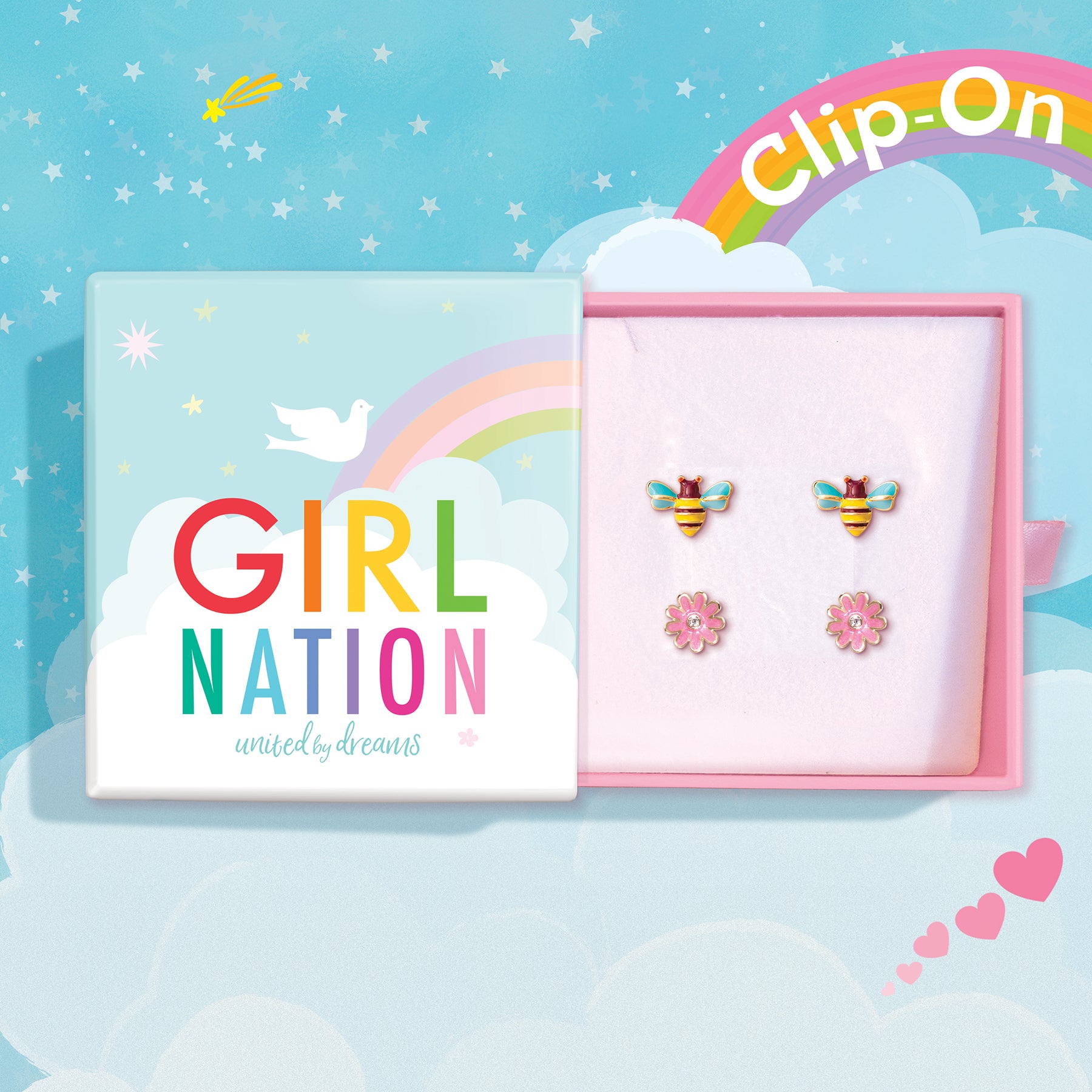 The perfect gift for little cuties with non-pierced ears! The Dynamic Duo Gift Set includes two pairs of themed kids earrings in an adorable Girl Nation Gift Box. The Buzz and Bloom set features a pair of cheerful bumblebees and a pair of pink daisies with sparkling crystal centers, providing a nature-inspired and stylish look for children. Girl Nation is a leader in clip-on technology, making these the ultimate comfortable earrings for kids. This set is a wonderful choice for a spring garden party, a bright birthday surprise, or a special back-to-school treat.