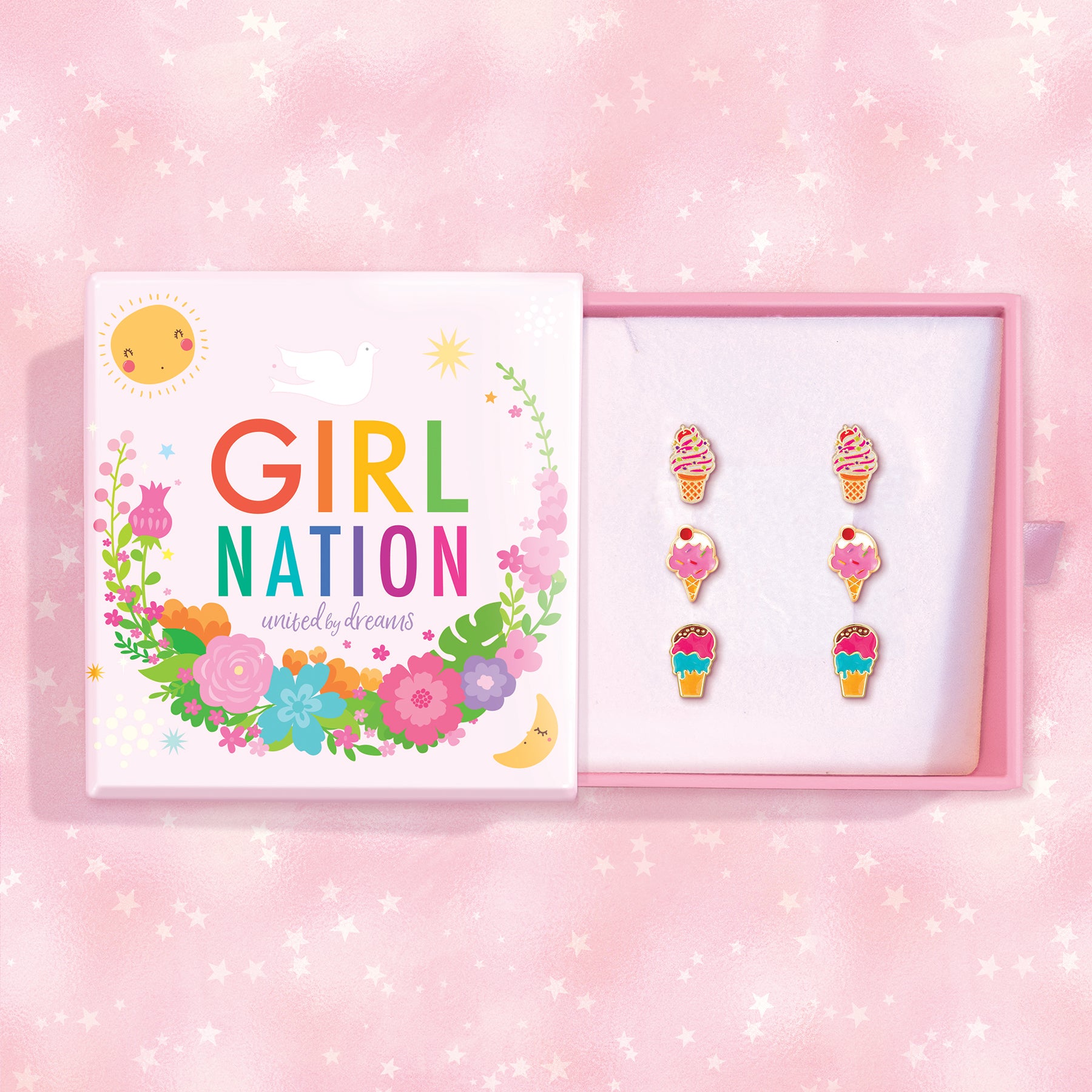 The perfect gift for little cuties! The Triple Treasure Gift Set includes three pairs of themed Cutie Stud Earrings in an adorable Girl Nation Gift Box. The Frosty Fun Trio includes a rainbow sprinkle soft serve cone, a classic single scoop with a cherry on top, and a colorful triple scoop ice cream cone, making it a wonderful choice for a refreshing summer treat, a fun ice cream party, or a sweet birthday surprise.