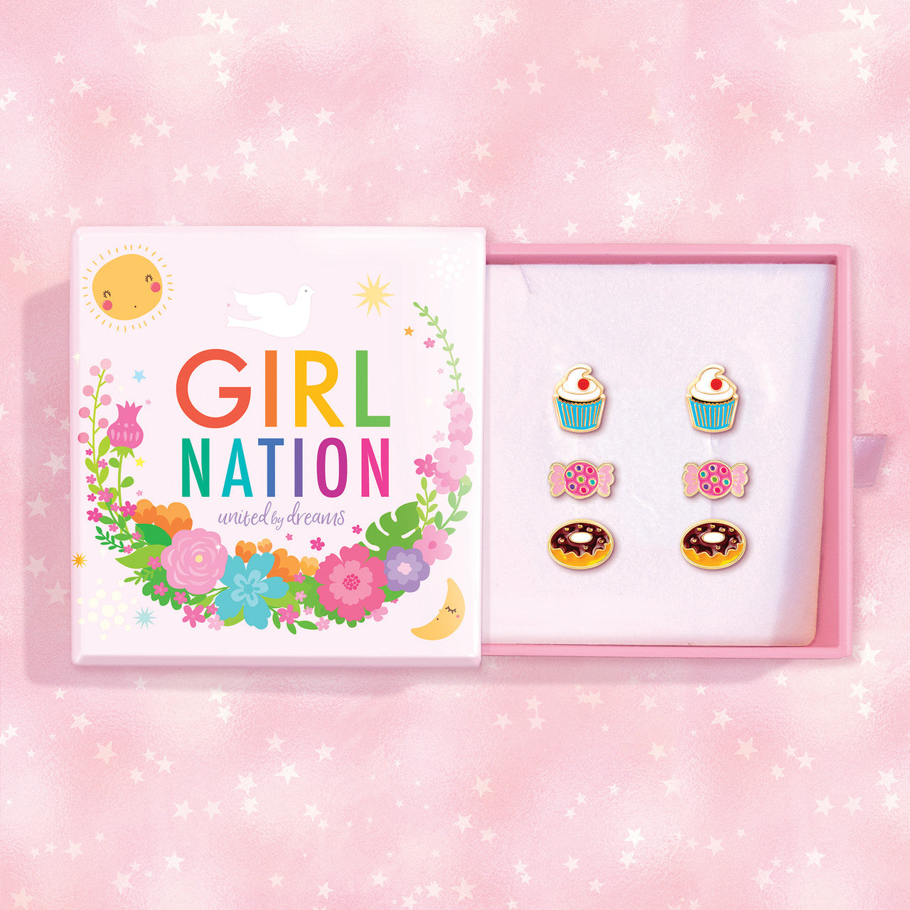 The perfect gift for little cuties! The Triple Treasure Gift Set includes three pairs of themed Cutie Stud Earrings in an adorable Girl Nation Gift Box. The Sweet Treats Gift Set includes cupcake, candy and donut earrings, making it a wonderful choice for a delightful birthday surprise, a fun party favor, or a sweet reward for a job well done.