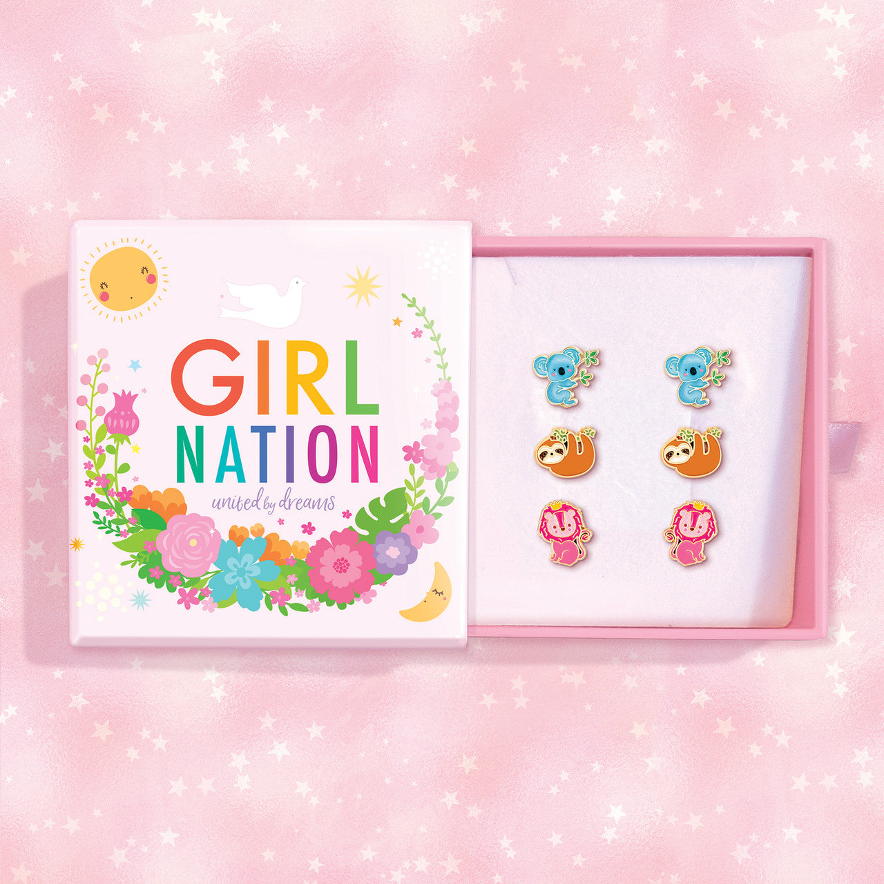 The perfect gift for little cuties! The Triple Treasure Gift Set includes three pairs of themed Cutie Stud Earrings in an adorable Girl Nation Gift Box. The Zoo Crew Gift Set includes koala, sloth and lion earrings, making it a wonderful choice for a memorable zoo trip souvenir, a wild animal-themed birthday surprise, or a special treat for little animal lovers.