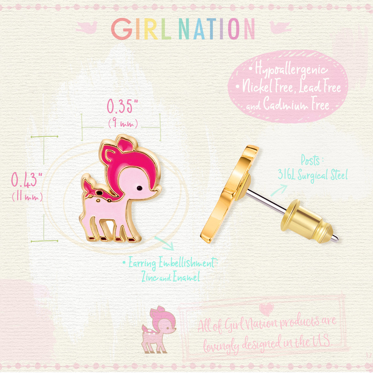 Easter gift darling deer earrings for girls. Hypoallergenic kids earrings and perfect Easter basket stuffer by Girl Nation Canada.
