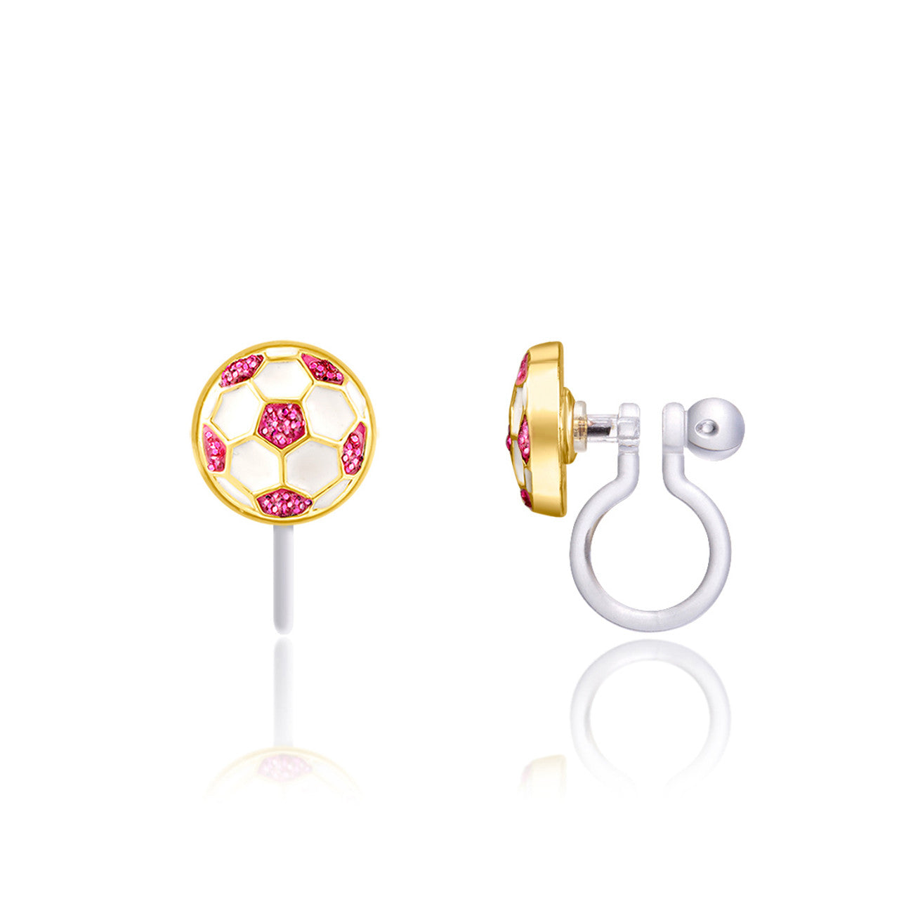 These Soccer Ball clip-on earrings feature a fun sports-inspired design with sparkling pink glitter accents.