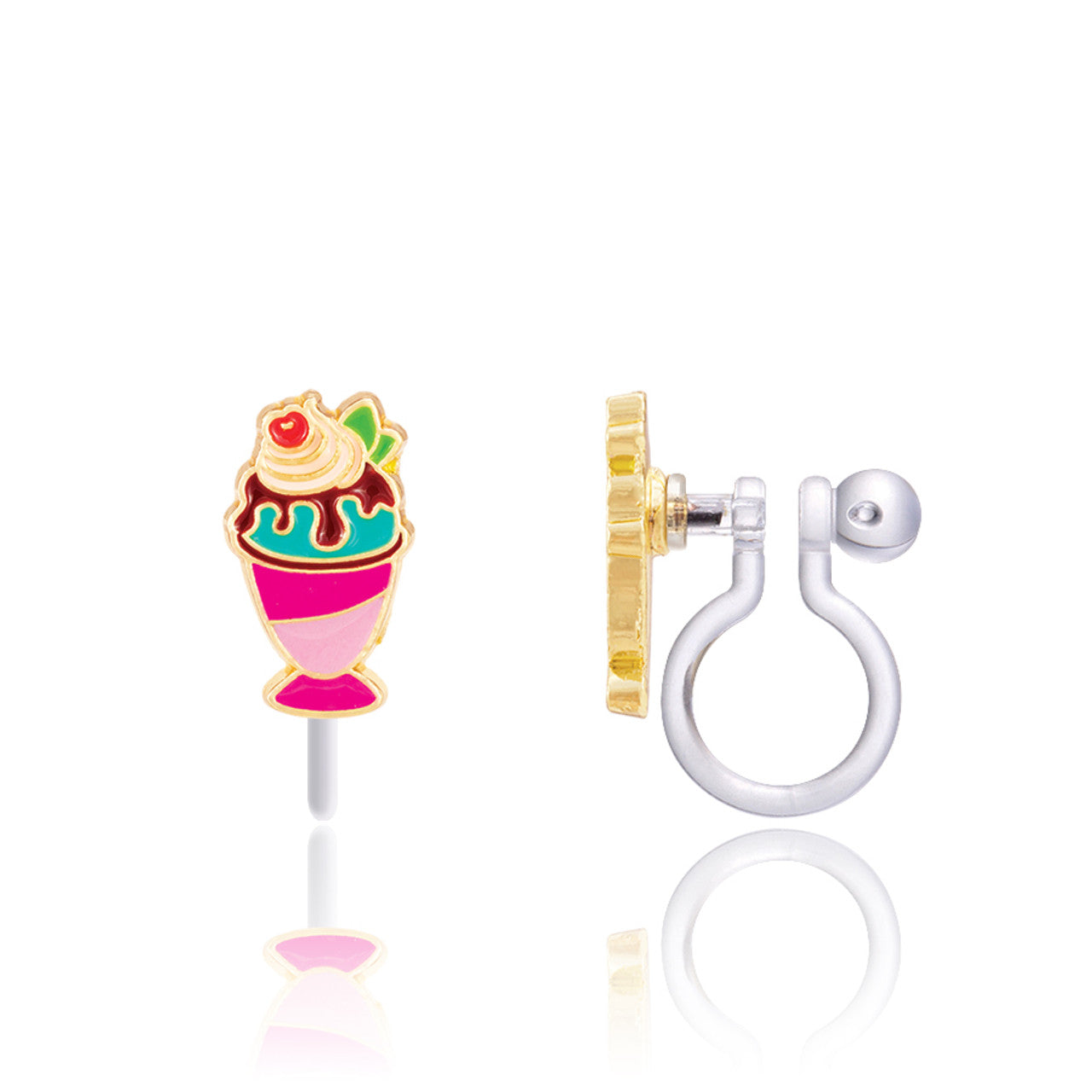 These Sundae Supreme clip-on earrings look just like a sweet, colorful ice cream sundae — complete with chocolate drizzle, whipped topping, and a cherry on top.
